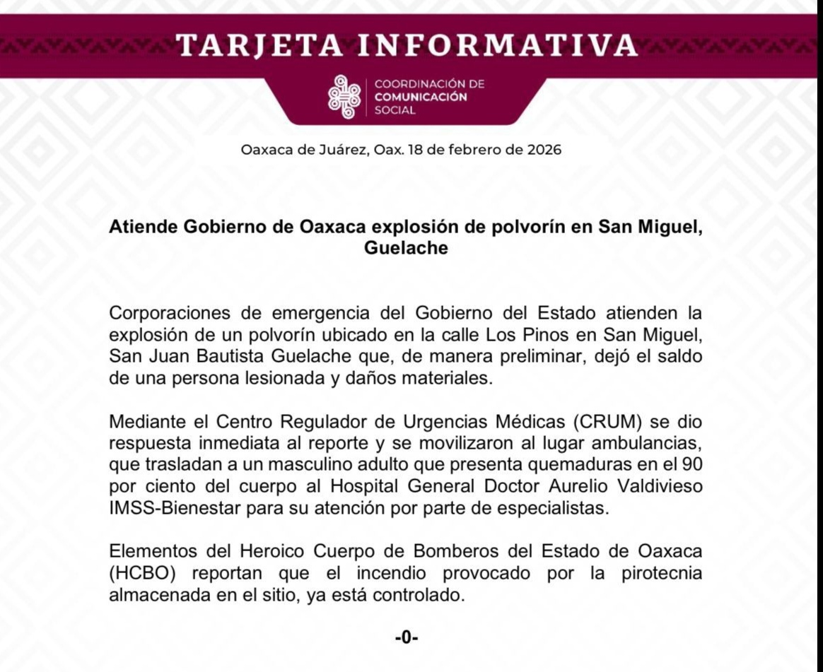 Corporaciones de emergencia del Gobierno del Estado atienden la explosión de un polvorín ubicado en la calle Los Pinos en San Miguel, San Juan Bautista Guelache que, de manera preliminar, dejó el saldo de una persona lesionada y daños materiales. Mediante el Centro Regulador de Urgencias Médicas (CRUM) se dio respuesta inmediata al reporte y se movilizaron al lugar ambulancias, que trasladan a un masculino adulto que presenta quemaduras en el 90 por ciento del cuerpo al Hospital General Doctor Aurelio Valdivieso IMSS-Bienestar para su atención por parte de especialistas.…