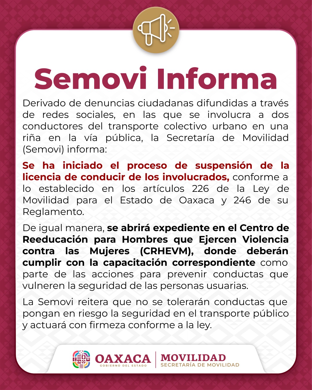Derivado de denuncias ciudadanas difundidas a través de redes sociales, en las que se involucra a dos conductores del transporte colectivo urbano en una riña en la vía pública, la Secretaría de Movilidad (Semovi) informó que ha iniciado el proceso de suspensión de la licencia de conducir de los involucrados. Detalló que esta sanción se aplica conforme a lo establecido en los artículos 226 de la Ley de Movilidad para el Estado de Oaxaca y 246 de su Reglamento. De igual manera, la dependencia dio a conocer que se abrirá…