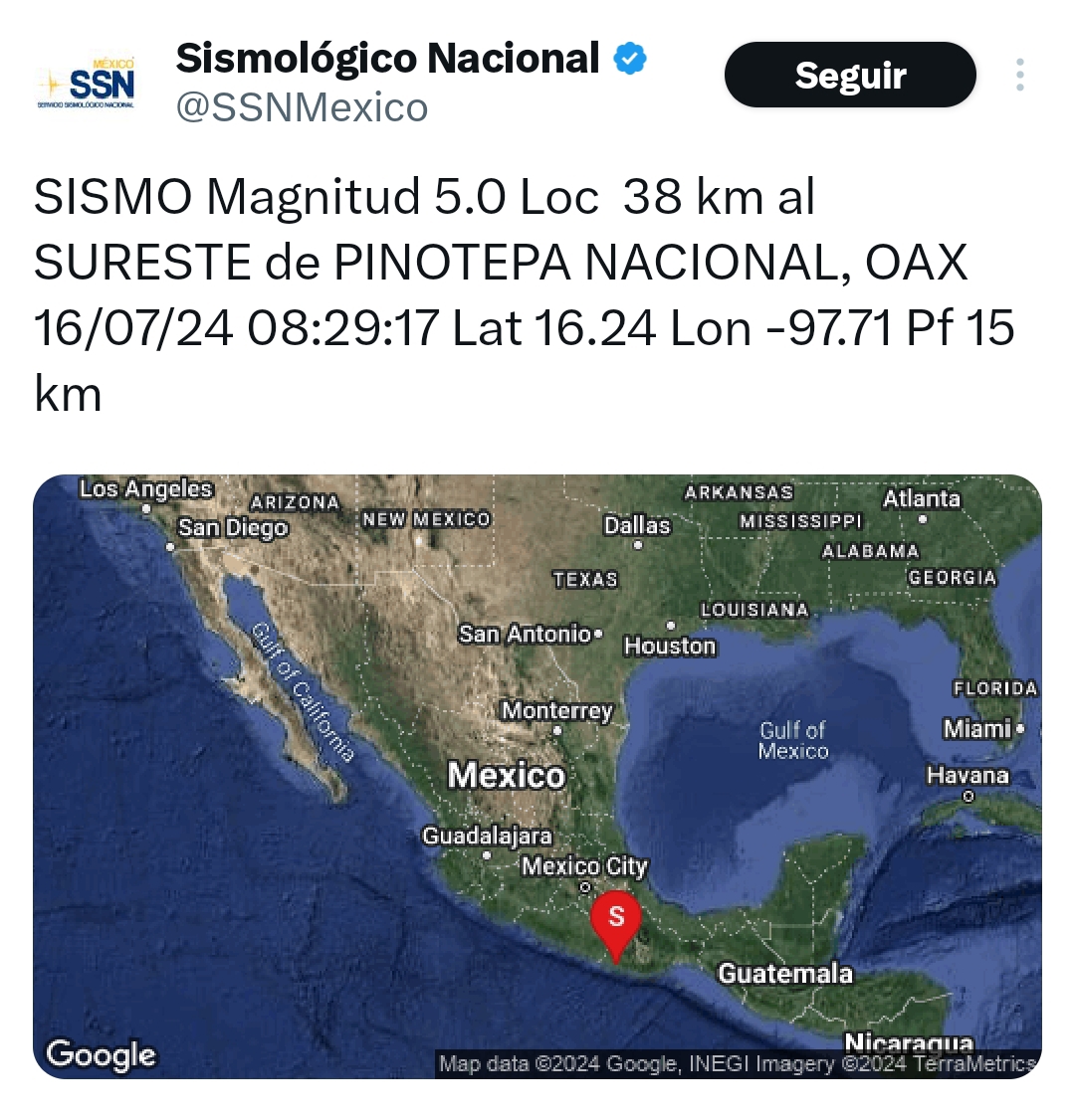 La Coordinación Estatal de Protección Civil y Gestión de Riesgos (CEPCyGR) informa que a las 08:29 horas de este día 16 de julio, se detectó según datos preliminares, un sismo de magnitud 5.0 al este de Pinotepa Nacional, lo que generó que se activara la alerta sísmica en la capital oaxaqueña.Hasta el momento no se reportan daños materiales, ni afectaciones a la población.La dependencia exhorta mantener la calma y atender las recomendaciones de Protección Civil e informarse a través de los medios y redes sociales oficiales: Facebook @CEPCYGRGobOax y en…
