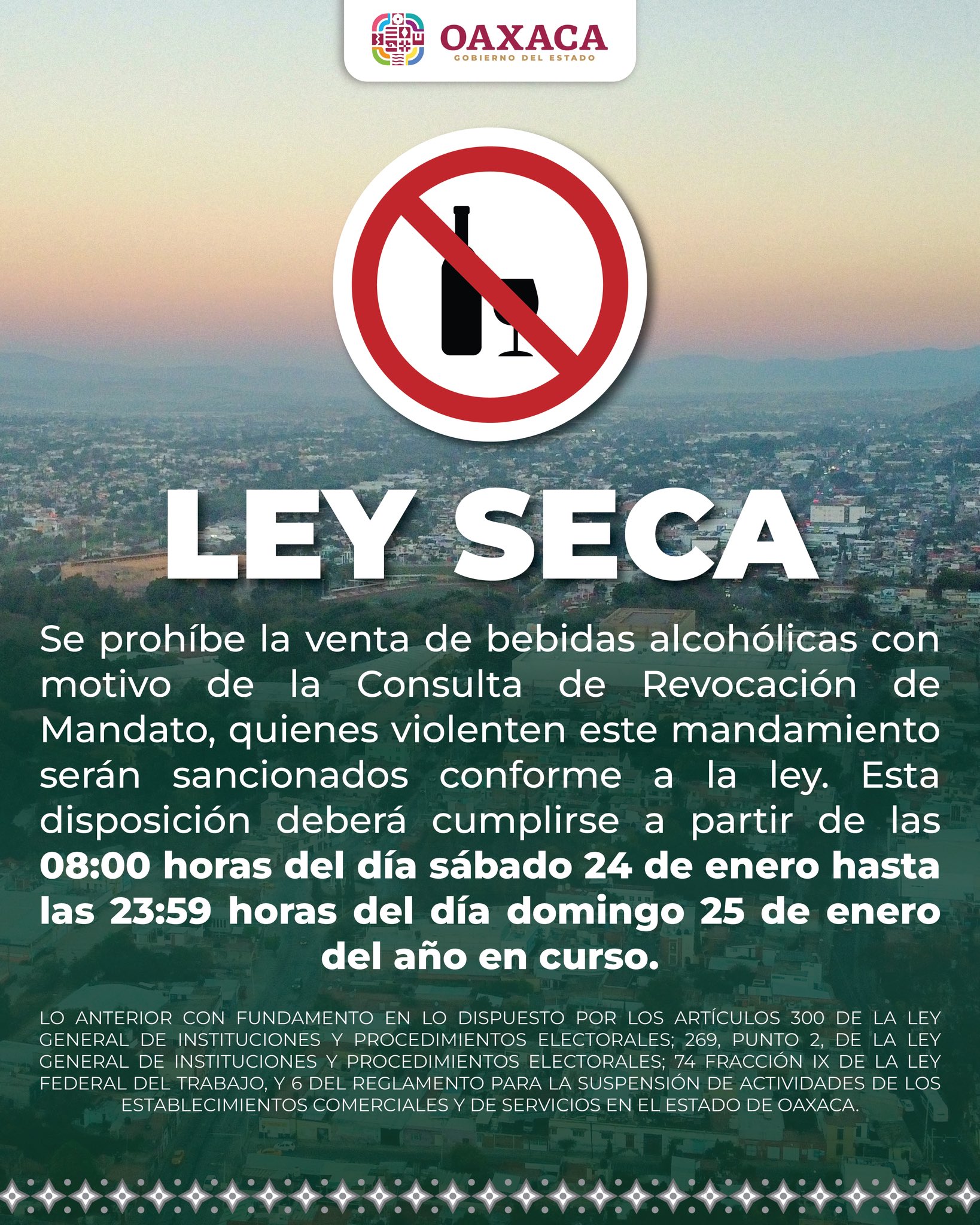 Oaxaca de Juárez, Oax., 23 de enero de 2026.- La Secretaría de Gobierno (Sego) informó que se aplicará Ley Seca en los 570 municipios de Oaxaca con motivo de la jornada de Revocación de Mandato.