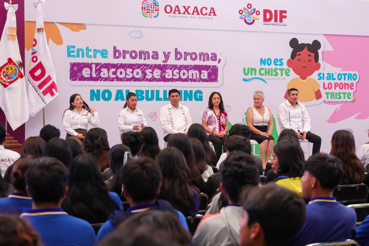 Oaxaca de Juárez, Oax., 9 de septiembre de 2024.- En una acción que antepone el Interés Superior de la Niñez y Adolescencia, el Sistema para el Desarrollo Integral de la Familia (DIF) Oaxaca arrancó el programa “Entre broma y broma, el acoso se asoma”, mediante el cual se busca construir comunidades escolares seguras en entornos que promuevan la inclusión, el desarrollo de relaciones saludables y valores como el respeto, la empatía y la solidaridad, a fin de hacer frente a esta situación en sus diversas manifestaciones.