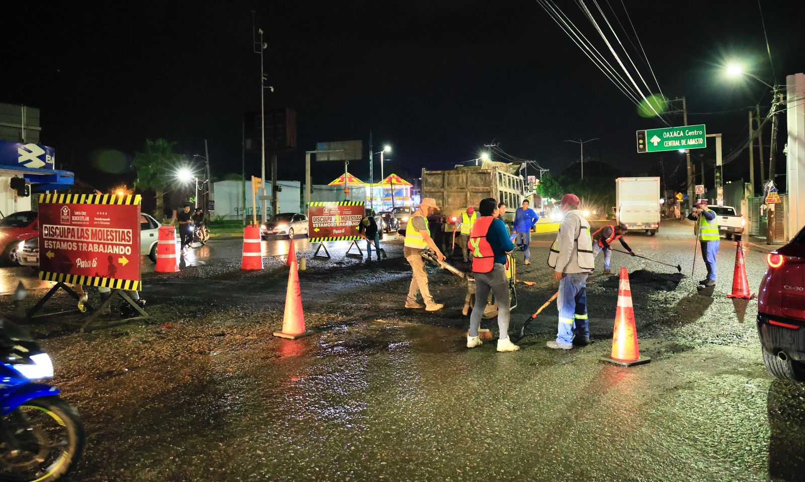 Santa Cruz Xoxocotlán, Oax., 30 de julio de 2025. En apoyo a la mejora vial y la movilidad segura para todas las familias, el Ayuntamiento de Santa Cruz Xoxocotlán implementa bacheo nocturno en zonas estratégicas como el Monumento a Juárez, el Crucero de la Ex‑Garita y el Boulevard Nuu Ita Nuu Yoo.
