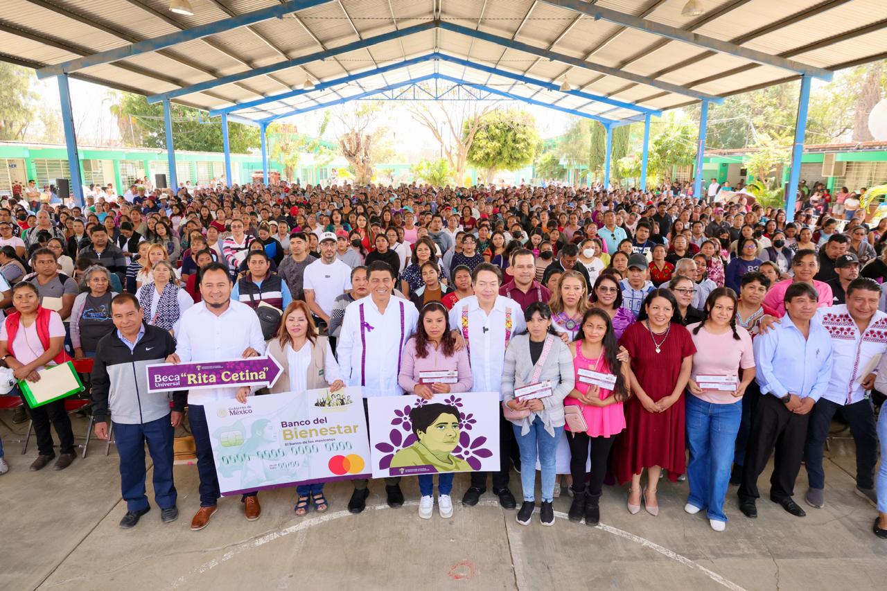 Santa Cruz Xoxocotlán, Oax. 7 marzo de marzo de 2025.- El Gobernador de Oaxaca, Salomón Jara Cruz y el titular de la Secretaría de Educación Pública (SEP), Mario Delgado Carrillo, encabezaron la asamblea para la entrega de 850 tarjetas de la Beca Rita Cetina, en beneficio de igual número de estudiantes de la escuela secundaria general “Genaro Vicente Vásquez”, situada en este municipio.