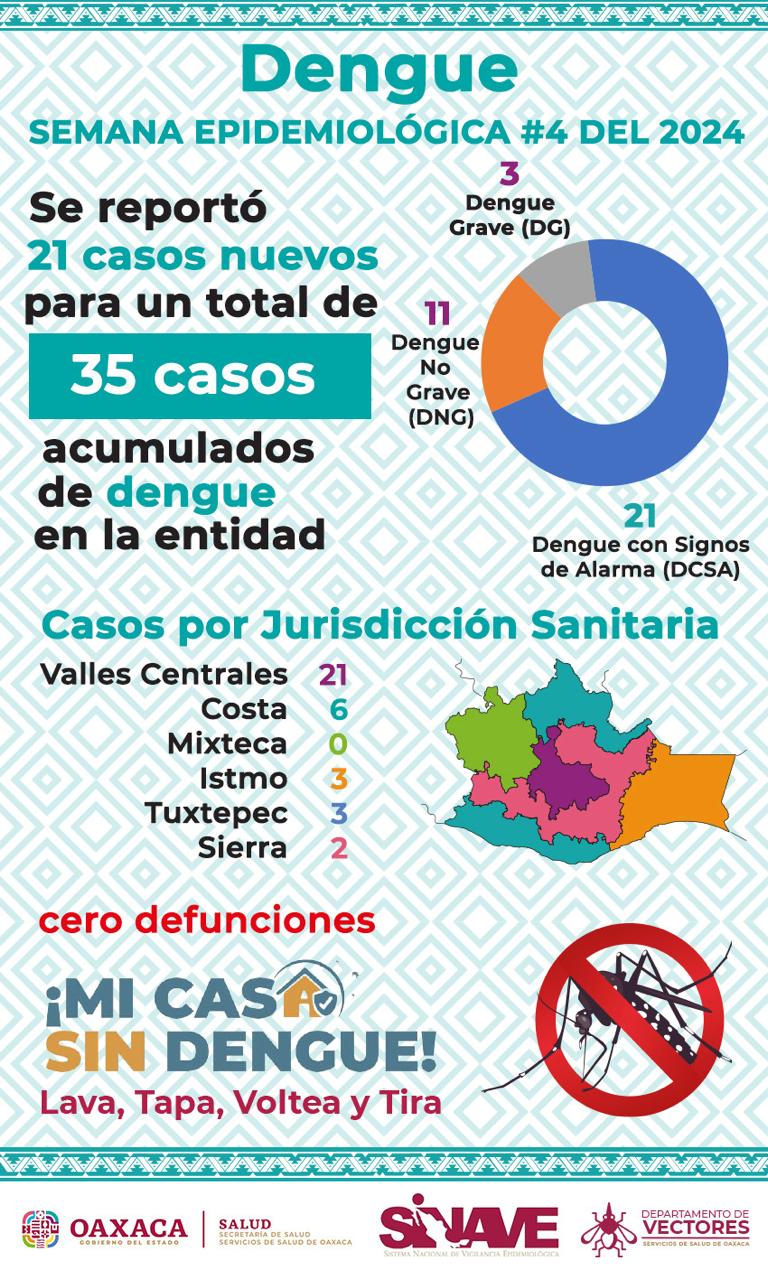 Los Servicios de Salud de Oaxaca (SSO) informaron que el mes de enero cierra con 35 casos confirmados acumulados de dengue, de los cuales 21 son reportes nuevos, 15 son mujeres y seis hombres.