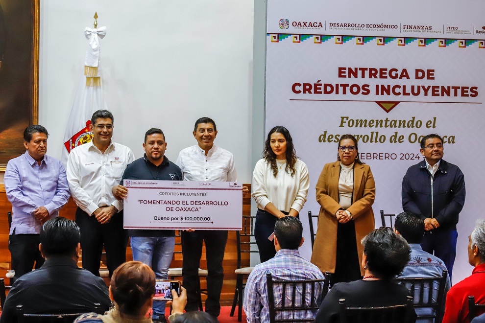 Oaxaca de Juárez, Oax. 6 de febrero de 2024.- Para fortalecer e incentivar las actividades empresariales en la entidad, el Gobernador Salomón Jara Cruz entregó Créditos Incluyentes como parte del programa Fomentando el Desarrollo de Oaxaca, que contempla a 25 personas beneficiarias de Valles Centrales, Mixteca, Cuenca y Costa con un monto de 2 millones 430 mil pesos.