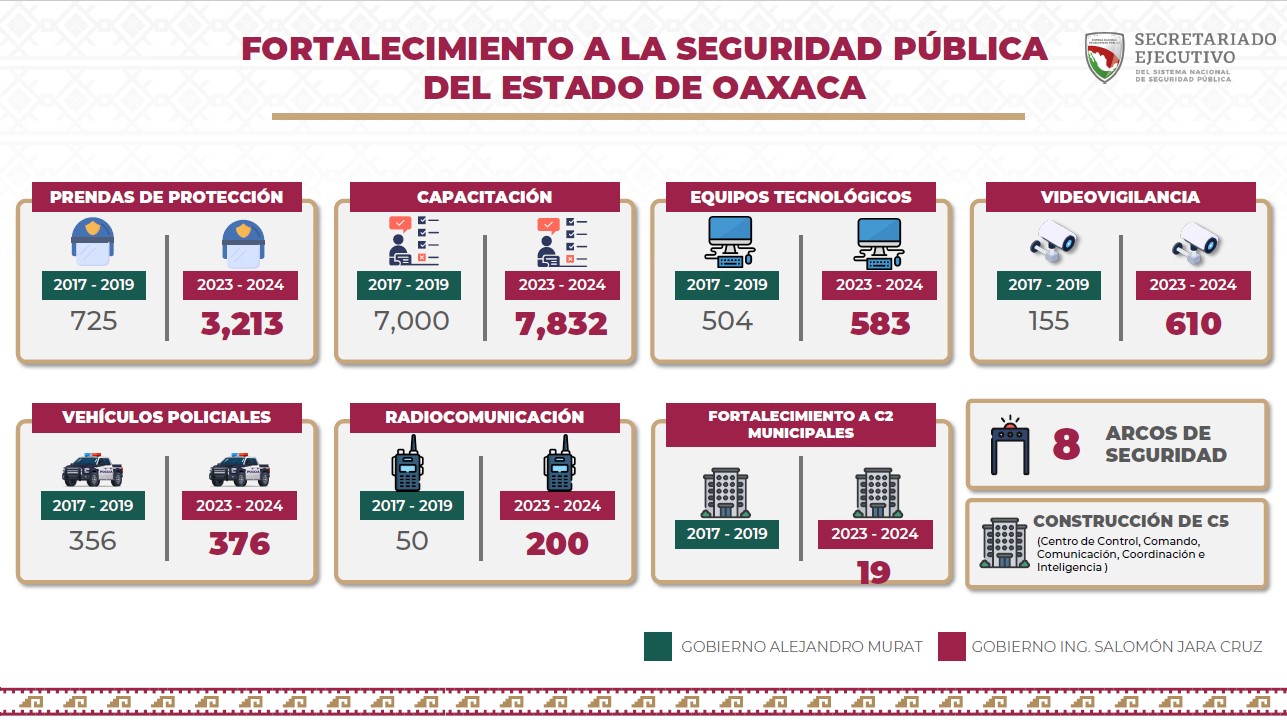 Oaxaca de Juárez, Oax. 8 de julio de 2025.- Con una inversión histórica de 780 millones 773 mil 500 pesos, en dos años, el Gobierno de la Primavera Oaxaqueña ha fortalecido la seguridad pública en el estado, con más equipo tecnológico, de protección, videovigilancia, patrullas y capacitación.
