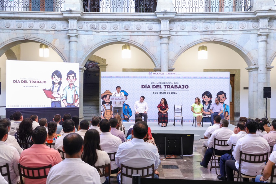 Oaxaca de Juárez, Oax. 1 de mayo de 2024.- Con ponencias de especialistas de Bolivia y México se conmemoró la edición 138 del Día Internacional del Trabajo en Palacio de Gobierno, desde donde se reconoció la lucha de las y los trabajadores para defender sus derechos y acceder a mejores condiciones laborales.