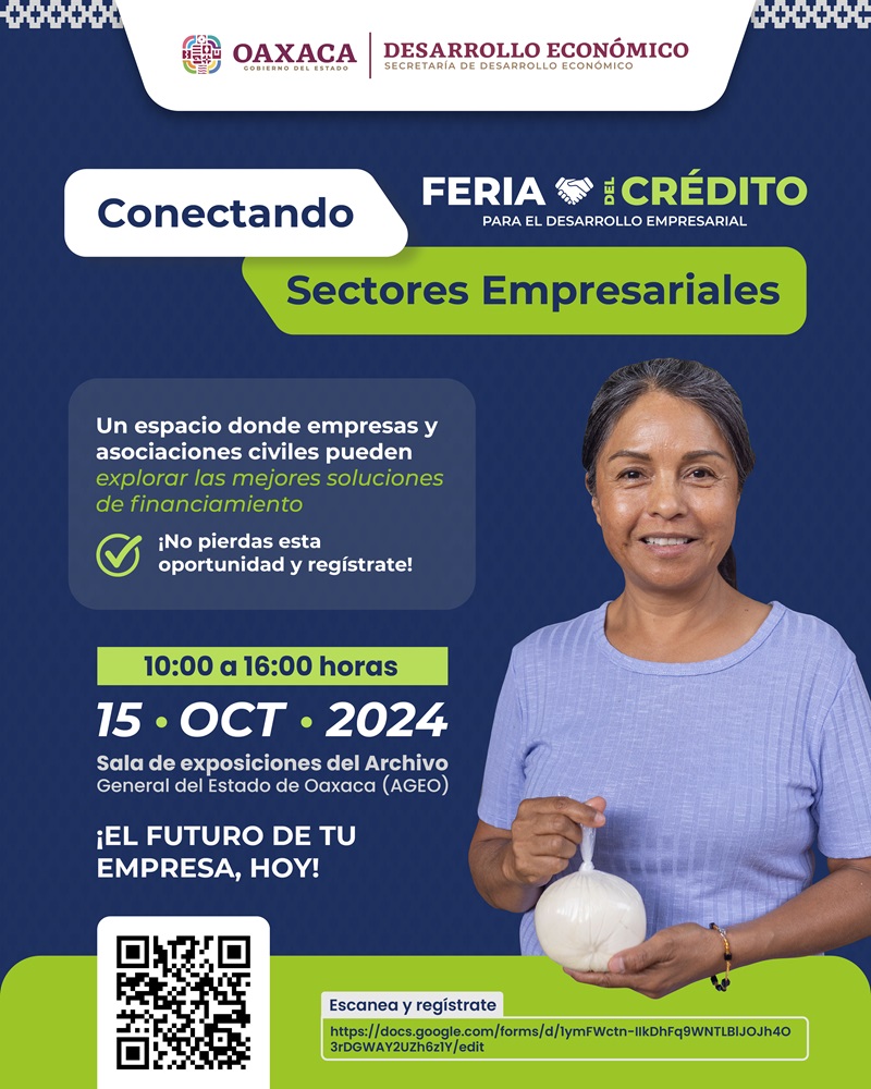Oaxaca de Juárez, Oax., 8 de octubre de 2024.- La Secretaría de Desarrollo Económico (Sedeco) invita a las micro, pequeñas y medianas empresas (Mipymes) a participar en la Feria del Crédito para el Desarrollo Empresarial, que se llevará a cabo el próximo 15 de octubre en la Sala de Exposiciones del Archivo General del Estado de Oaxaca (AGEO), en un horario de 10:00 a 16:00 horas.