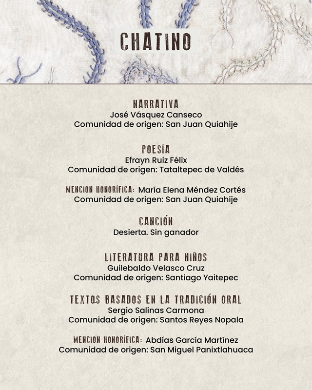 En Chatino, Efrayn Ruiz Félix, José Vázquez Canseco, Guilebaldo Velasco Cruz y Sergio Salinas Carmona. Además. recibieron mención honorífica: María Elena Méndez Cortés y Abdías García Martínez.