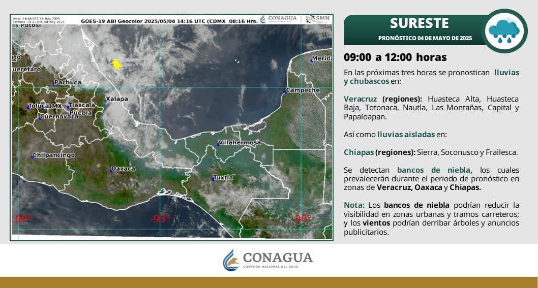 La Coordinación Estatal de Protección Civil y Gestión de Riesgos (CEPCyGR) informa que en las próximas horas se presentarán lluvias intermitentes y episodios de aguaceros con tormentas aisladas.