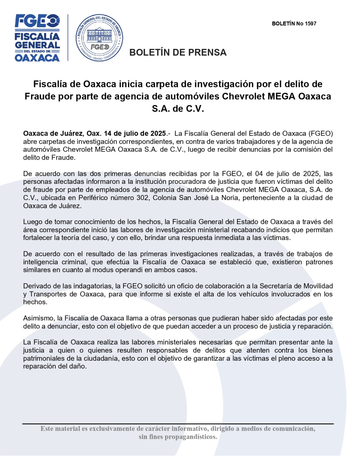 Oaxaca de Juárez, Oax. 14 de julio de 2025.- La Fiscalía General del Estado de Oaxaca (FGEO) abre carpetas de investigación correspondientes, en contra de varios trabajadores y de la agencia de automóviles Chevrolet MEGA Oaxaca S.A. de C.V., luego de recibir denuncias por la comisión del delito de Fraude.