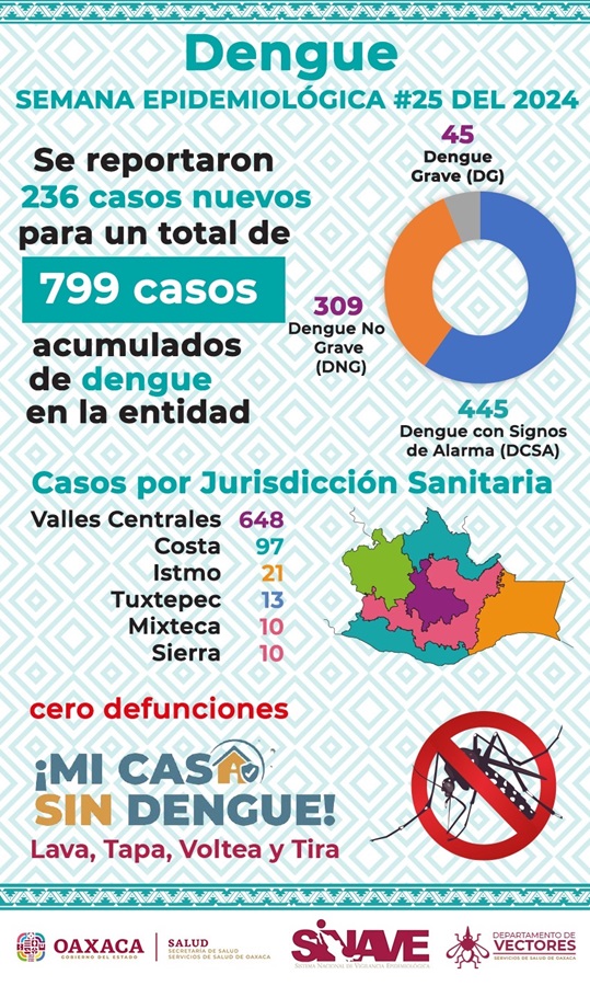 Por Jurisdicción Sanitaria, Valles Centrales acumula 648 casos; Costa 97; Istmo 21; Tuxtepec 13; Mixteca 10 e igual número en la Sierra.