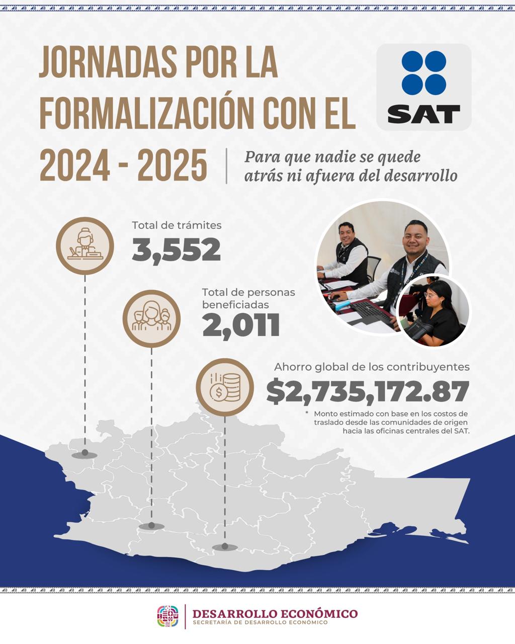 Estas acciones representaron un ahorro global de 2 millones 735 mil 172 pesos, calculado en función de los gastos de traslado que se hubieran requerido desde las comunidades de origen, hacia las oficinas centrales del SAT.