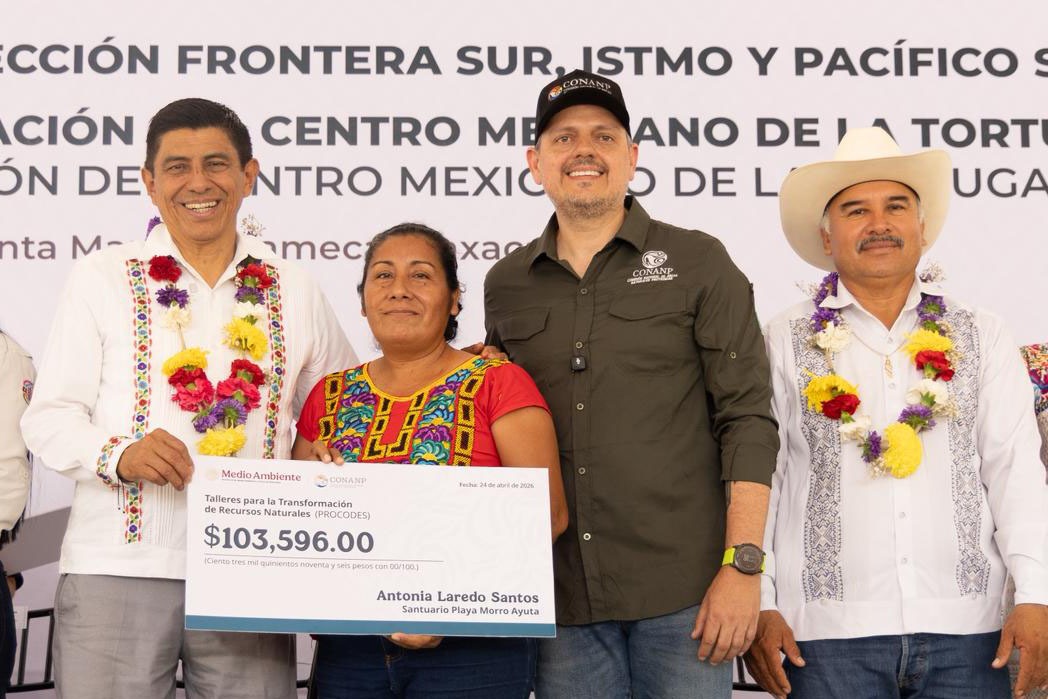 Santa María Tonameca, Oax. 24 de abril de 2026.- El Gobernador Salomón Jara Cruz encabezó la entrega de 26 millones de pesos para el fortalecimiento y operación de la primera etapa de rehabilitación del Centro Mexicano de la Tortuga en Mazunte, Santa María Tonameca, acción que brinda la continuidad de la preservación marina.