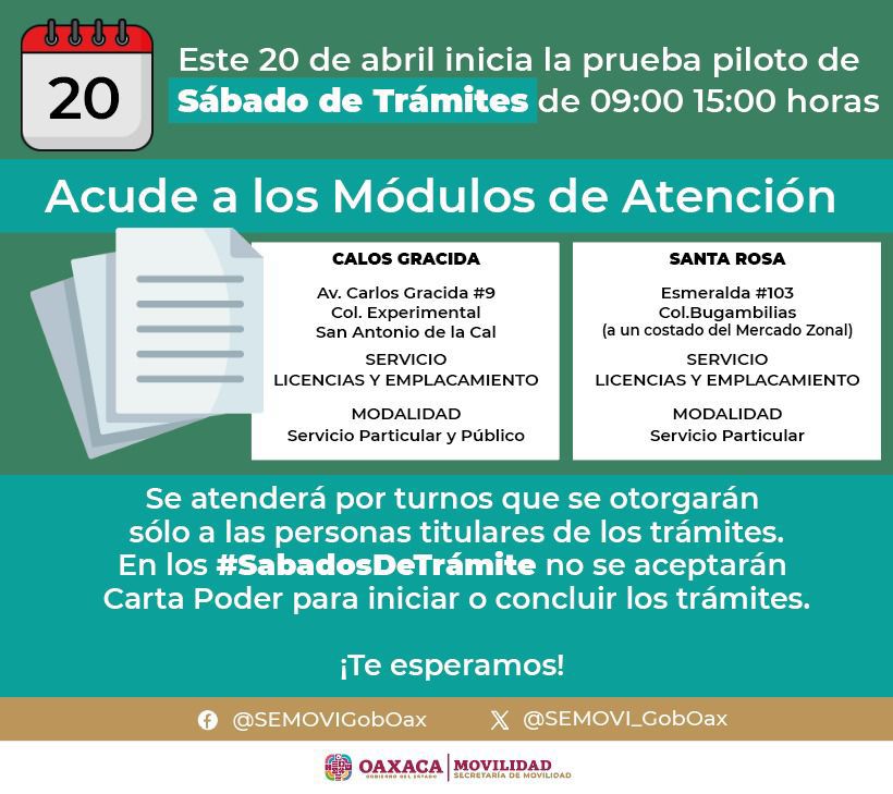 Oaxaca de Juárez, Oax. 20 de abril de 2024.- La Secretaría de Movilidad (Semovi) en coordinación con la Secretaría de Finanzas (Sefin) del Gobierno del Estado, implementa la prueba piloto Sábado de Trámites, con el objetivo de garantizar que las y los contribuyentes realicen sus trámites correspondientes.