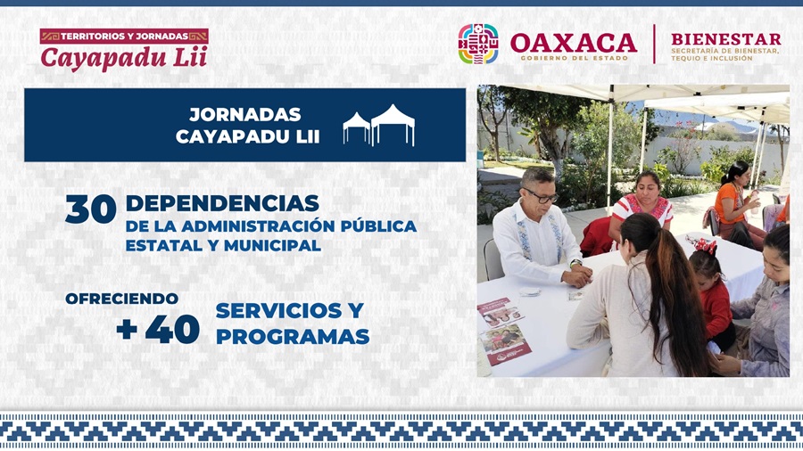 Oaxaca de Juárez, Oax. 13 de enero de 2025.- La Secretaría de Bienestar, Tequio e Inclusión (Sebienti) implementará la estrategia Territorios y Jornadas Cayapadu Lii, la cual contará con un despliegue de 300 personas brigadistas, que visitarán casa por casa en los municipios de Oaxaca de Juárez, Santa Lucía del Camino y Santa Cruz Xoxocotlán.