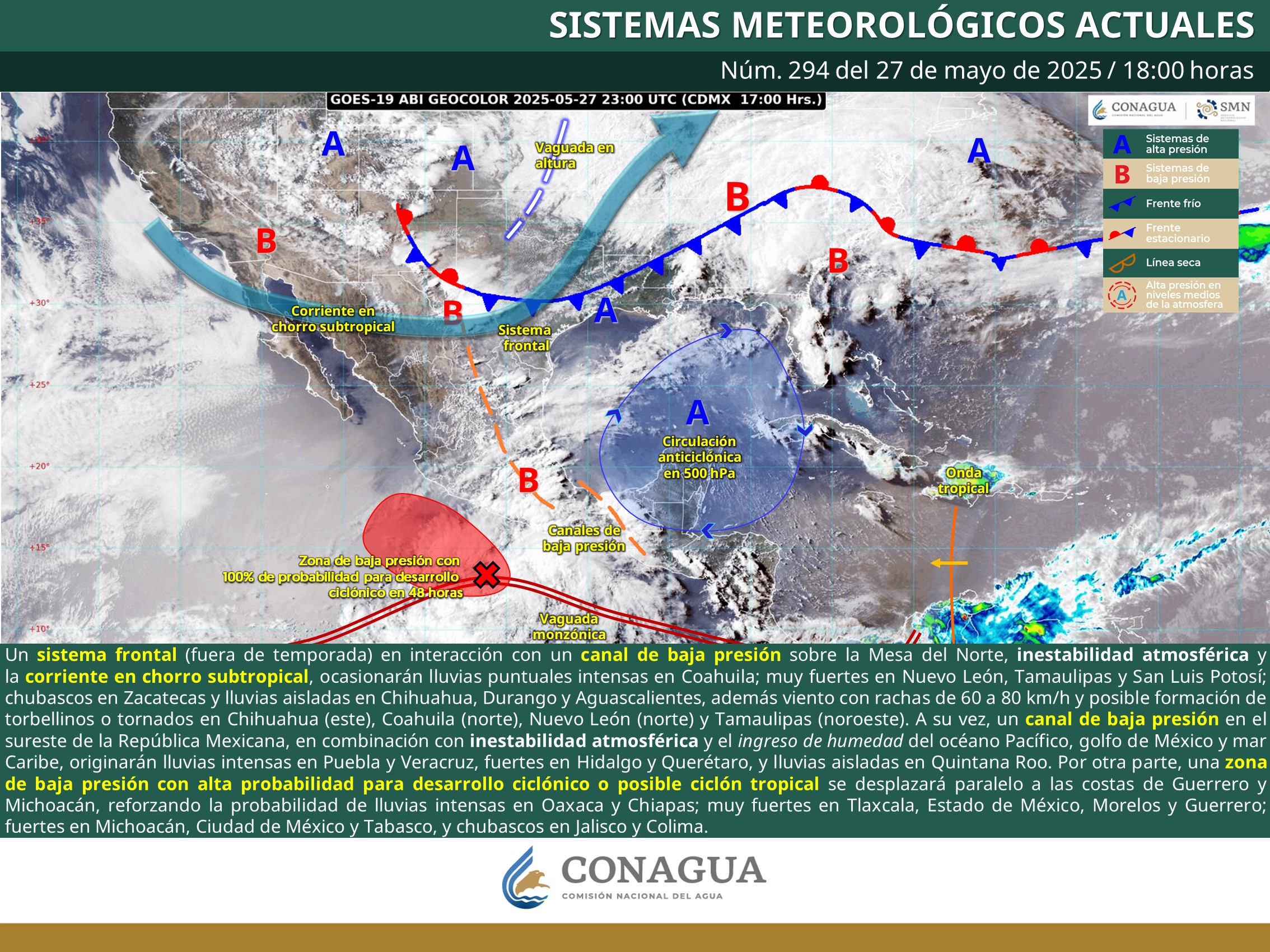 La Coordinación Estatal de Protección Civil y Gestión de Riesgos (CEPCyGR) informa que, de acuerdo con la imagen satelital más reciente, la zona de baja presión ubicada frente a las costas de Oaxaca y Guerrero presenta una estructura aún desorganizada; sin embargo, es inminente que en las próximas horas evolucione a potencial ciclón tropical o depresión tropical.