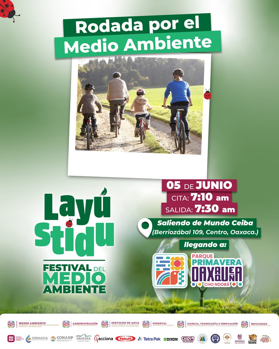 Oaxaca de Juárez, Oax. 4 de junio de 2025.- El Gobierno del Estado invita a sumarse al arranque del Festival del Medio Ambiente “Layú Stidu”, que iniciará este 5 de junio con la Rodada por el Medio Ambiente, un paseo en bicicleta abierto a toda la población.