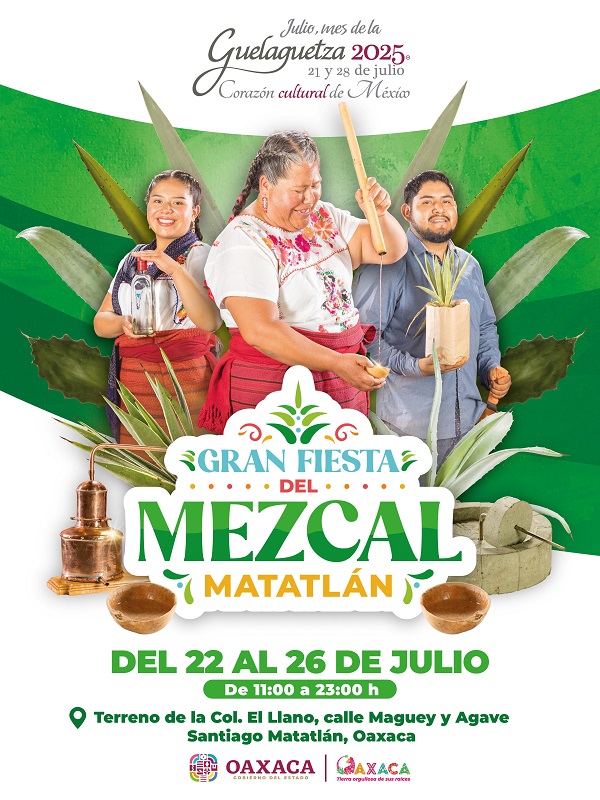 Oaxaca de Juárez, Oax. 19 de julio de 2025.- El Gobierno del Estado, a través de la Secretaría de Turismo (Sectur) Oaxaca invita a la Gran Fiesta del Mezcal de Santiago Matatlán, que se realizará del 22 al 26 de julio en el marco de las fiestas de la Guelaguetza 2025, en la explanada del municipio considerado como la cuna mundial de este destilado.