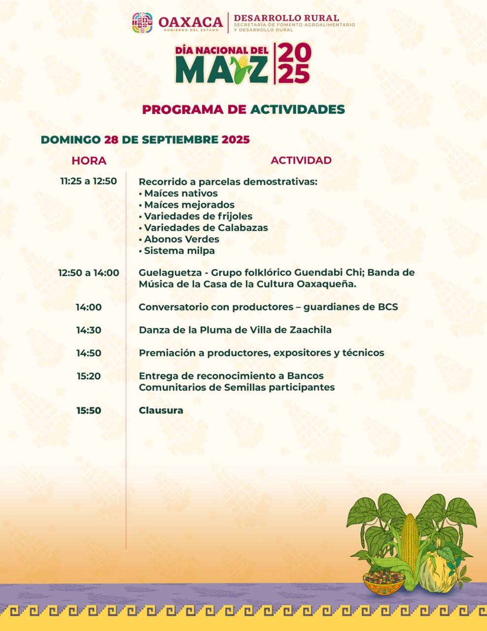 San Bartolo Coyotepec, Oax. 26 de septiembre de 2025.- A través de conferencias y actividades de reflexión, la Secretaría de Fomento Agroalimentario y Desarrollo Rural (Sefader) celebrará este domingo 28 de septiembre el Día Nacional del Maíz en el Bosque El Tequio, en Santa Cruz Xoxocotlán.