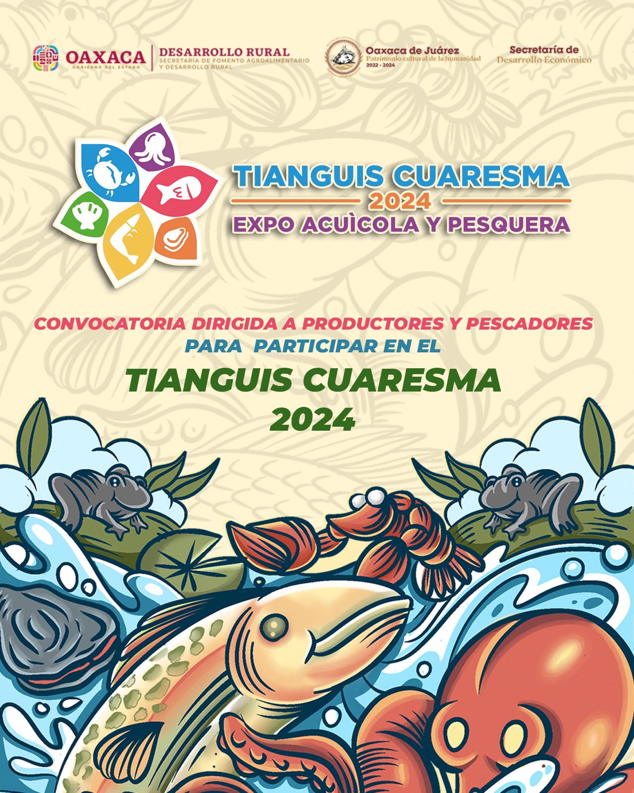 La Secretaría de Fomento Agroalimentario y Desarrollo Rural (Sefader) del Gobierno del Estado y la Secretaría de Desarrollo Económico del municipio de Oaxaca de Juárez, invitan a las y los productores acuícolas y pesqueros a participar en el Tianguis Cuaresma 2024 para exponer y vender sus productos frescos o preparados.