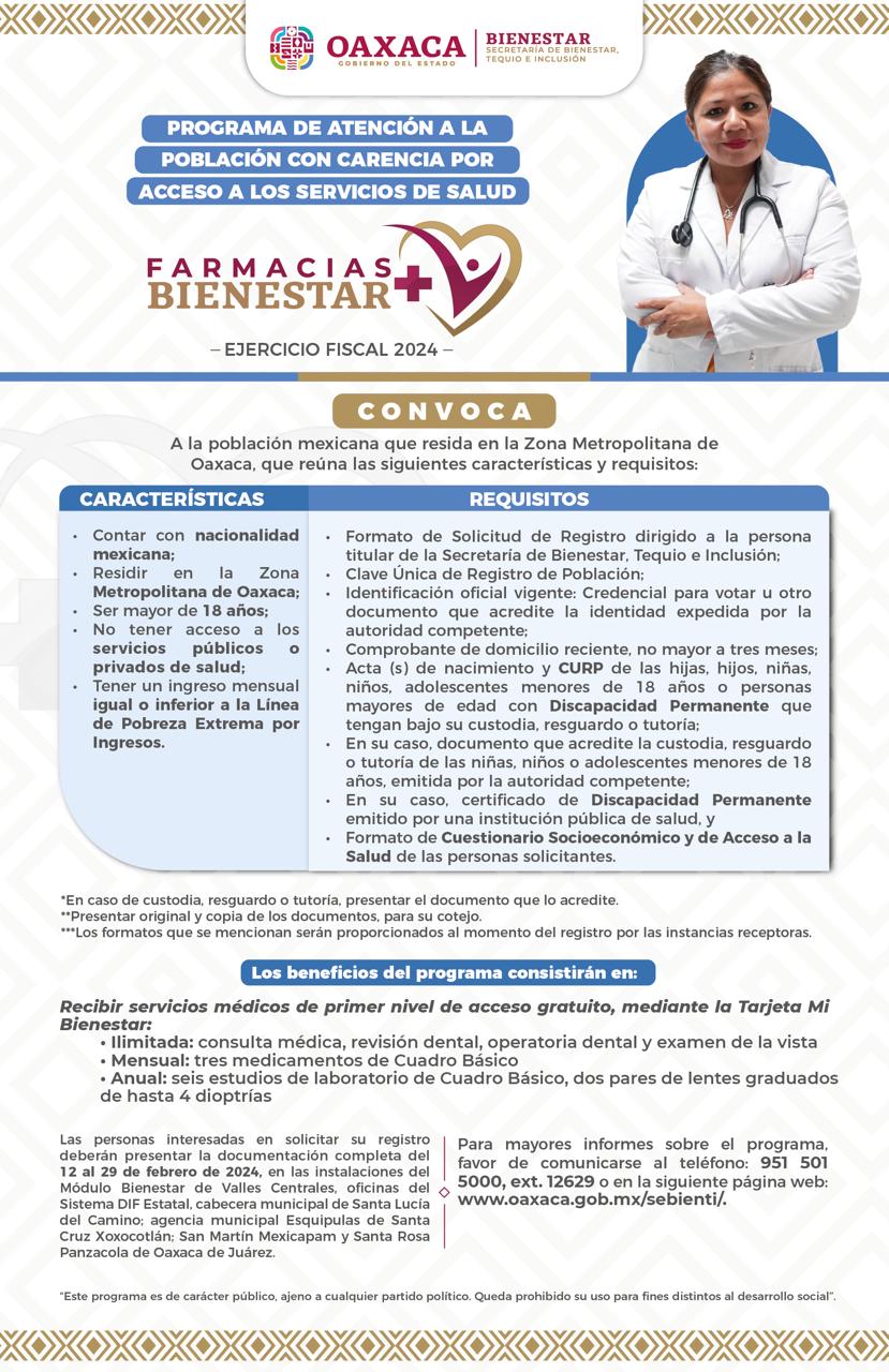 Oaxaca de Juárez, Oax. 13 de febrero de 2024.- Con el objetivo de garantizar el acceso al derecho a la salud de las y los oaxaqueños, el Gobierno del Estado a través de la Secretaría de Bienestar, Tequio e Inclusión (Sebienti) lanzó la convocatoria del programa de Atención a la Población con Carencia por Acceso a los Servicios de Salud, Farmacias Bienestar.