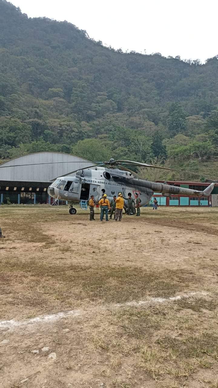 Oaxaca de Juárez.- 9 de junio.- Para reforzar los trabajos de combate del incendio por tierra que se realizan en San José Tenango, en la región de la Sierra de Flores Magón, arribó el helicóptero de la Secretaría de la Defensa Nacional (Sedena), informó el Gobierno del Estado a través de la Comisión Estatal Forestal (Coesfo).