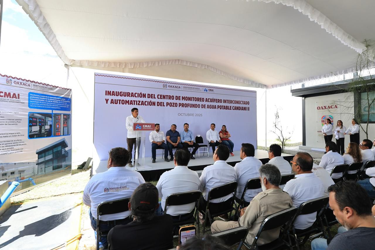Oaxaca de Juárez, Oax. 12 de octubre de 2025.- El Gobernador Salomón Jara Cruz inauguró el Centro de Monitoreo Acuífero Interconectado (CMAI) en la agencia municipal Candiani, que moderniza la distribución del agua potable en la capital oaxaqueña y garantiza su manejo eficaz.