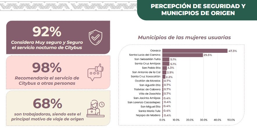 Cabe mencionar que, del 2 al 8 de mayo, se realizó la encuesta en la que las usuarias de las rutas RC01 Terminal Viguera – San Sebastián Tutla y RC02 Walmart/ Zona Plaza del Valle- FOVISSTE Módulo Azul, expresaron su opinión de este servicio que abarca un horario de 21:00 horas a 24:00 horas de domingo a jueves, y de 21:00 horas a 3:00 horas los viernes y sábados