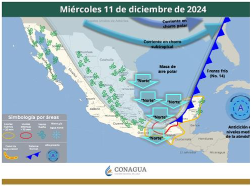 Las marcas térmicas estarán por debajo del nivel de congelación en zonas altas de la Mixteca y Sierra de Juárez, además de generar mucha inestabilidad con lluvias de intensidad variable en la región de la Cuenca del Papaloapan, norte del Istmo de Tehuantepec, Sierra de Flores Magón y Sierra de Juárez.
