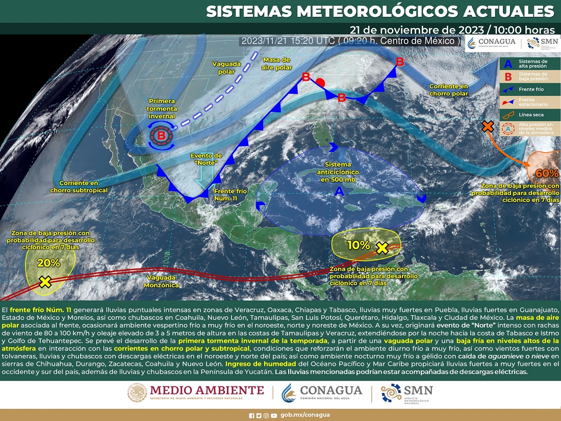 La Coordinación Estatal de Protección Civil y Gestión de Riesgos (CEPCyGR) emitió un alertamiento ante el desplazamiento del frente frío número 11 por territorio nacional, el cual ocasionará descenso en la temperatura, evento de norte, lluvias y oleaje elevado en diferentes regiones de la entidad.