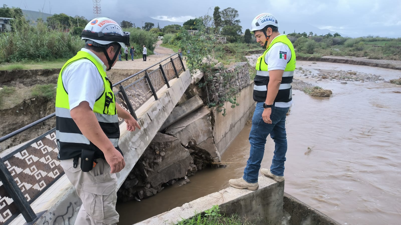 Personal de la Dirección de Respuesta Inmediata de la Coordinación Estatal de Protección Civil y Gestión de Riesgos (CEPCyGR) informó que la mañana de este lunes se llevó a cabo la evaluación de daños del puente que conecta a la calle Revolución con la población de San Pablo Villa de Mitla, el cual colapsó por las constantes lluvias que se han registrado en días anteriores.