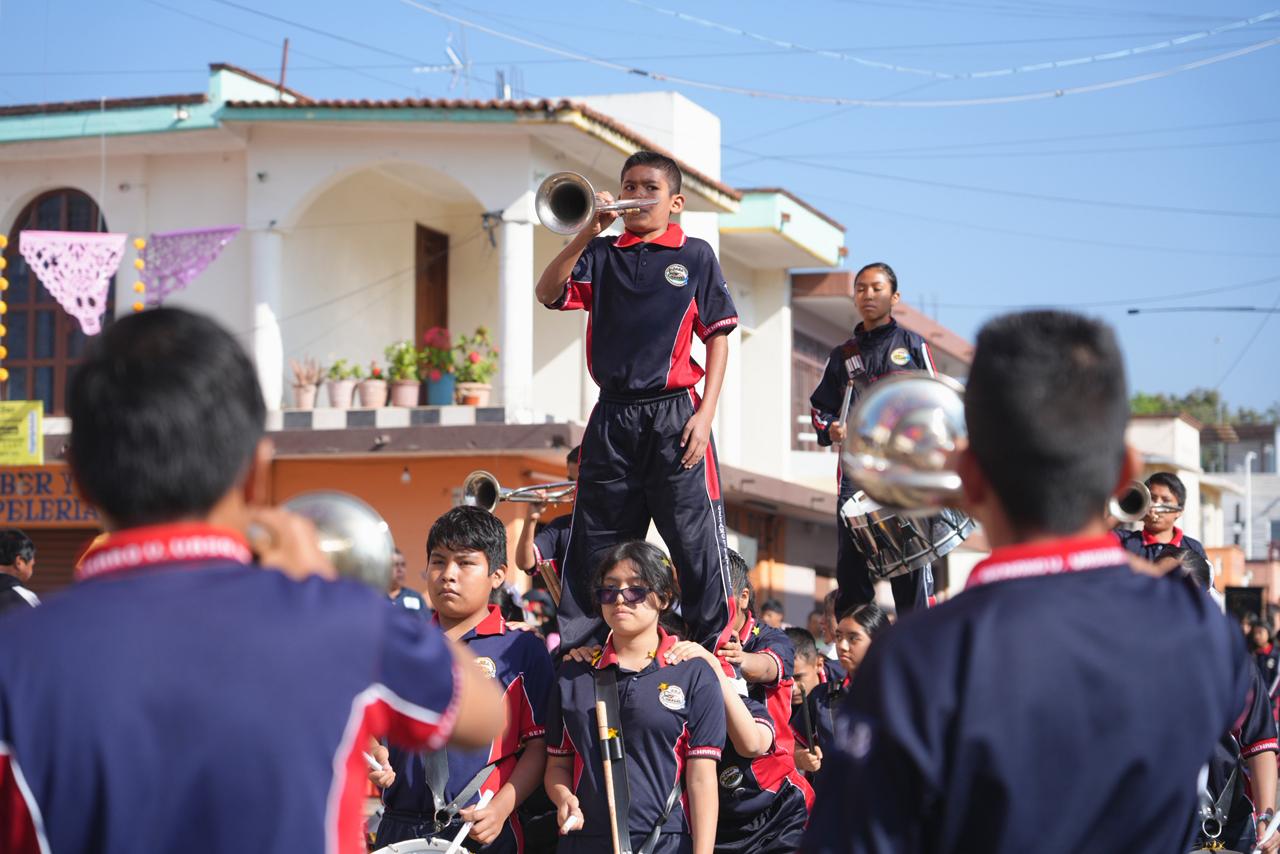 Cada escuela presentó dinámicas llenas de energía y creatividad, que incluyeron bailes, acrobacias, bandas de guerra y la participación de niñas y niños caracterizados como los personajes más emblemáticos de la Revolución.