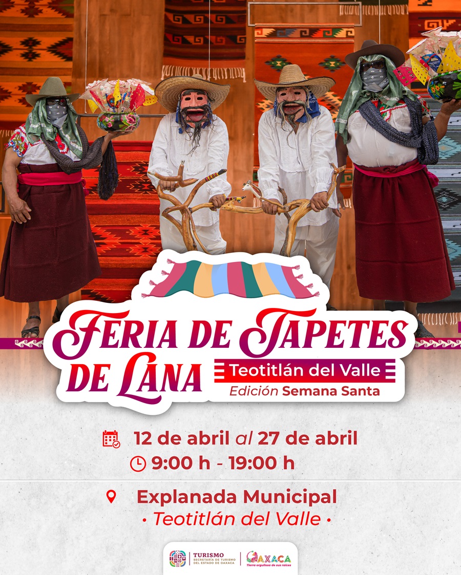 Oaxaca de Juárez, Oax., 11 de abril de 2025.- En el marco de la temporada de Semana Santa, Teotitlán del Valle realizará la Feria de Tapetes de Lana, del 12 al 27 de abril, en la explanada municipal de la población, en un horario de 9:00 a 19:00 horas.
