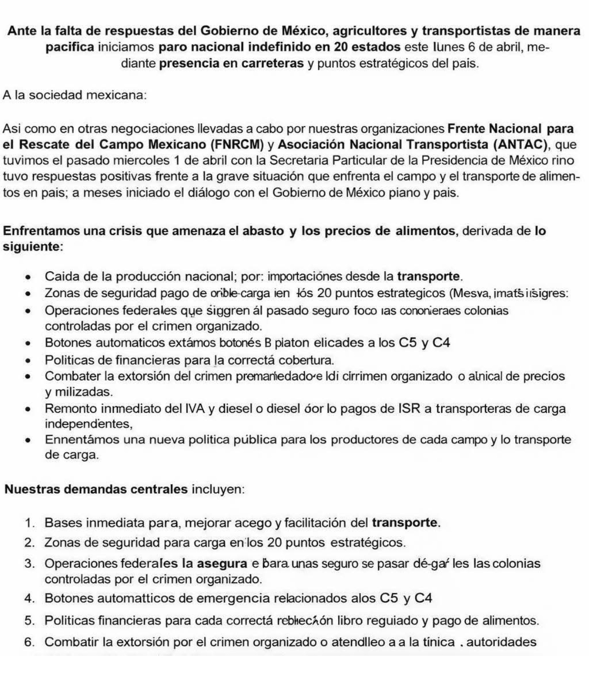 Para el día lunes 6 de abril diversos líderes de organizaciones del campo y transportistas han anunciado que cerrarán algunas carreteras.