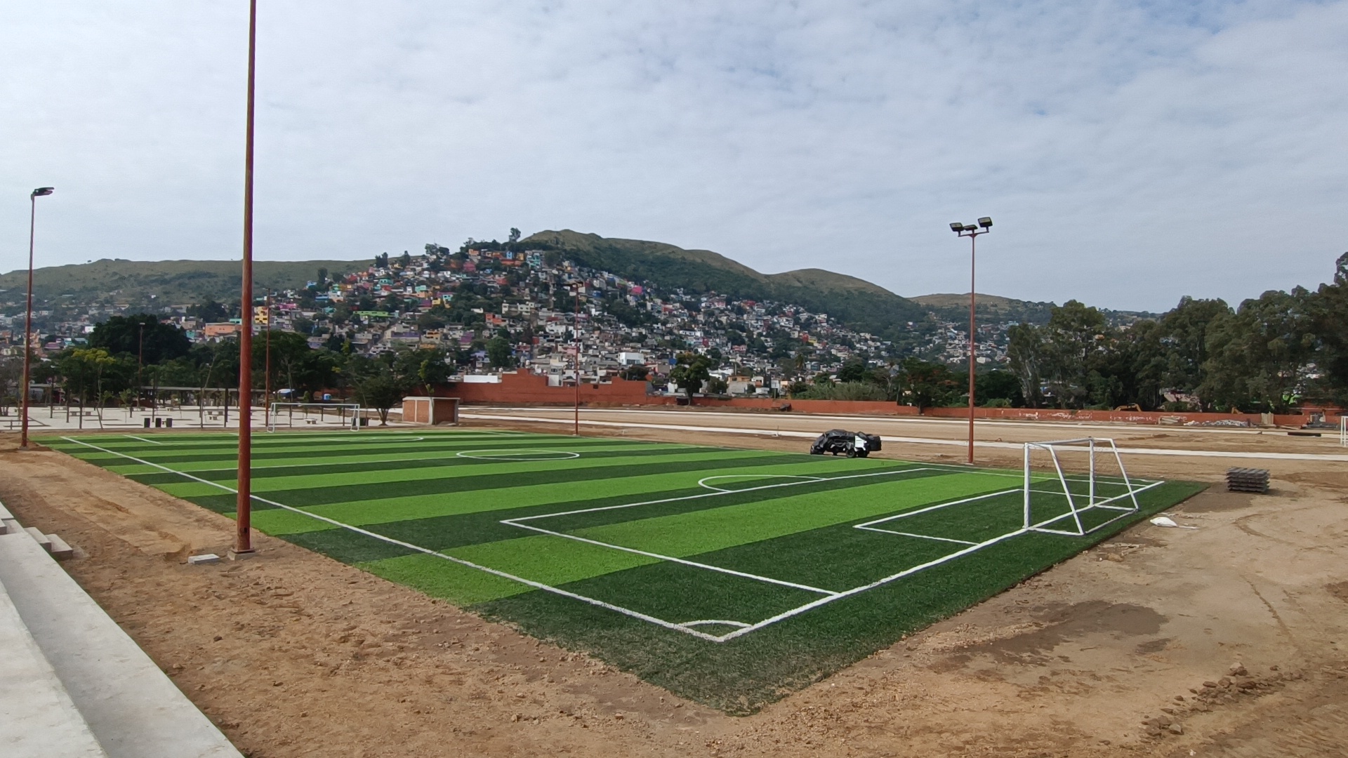 En la plaza norte del Parque Primavera Oaxaqueña, el Mandatario estatal apreció la construcción de las canchas de futbol 5, 7 y 11, la de básquetbol, pista de atletismo de tartán con 8 carriles, el skate park y el parkour.